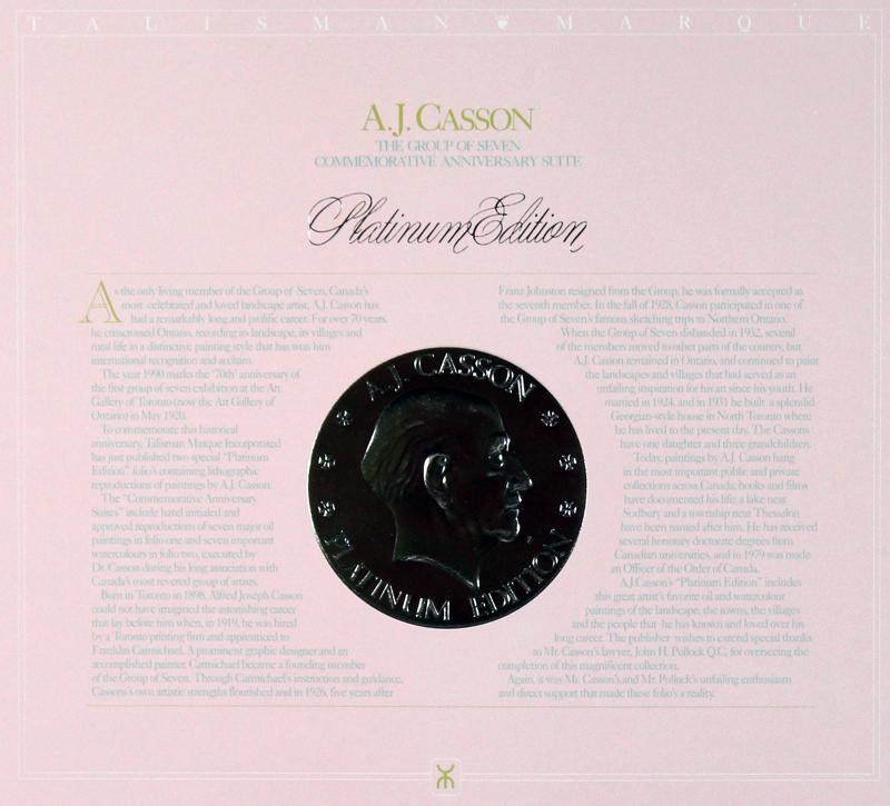 Note: Created to commemorate the 70th anniversary of the first Group of Seven exhibition in May 1920. Folio I reproduces 7 important paintings by A. J. Casson. This folio includes “The Client”, “Aftermath”, “North Channel”, “Mill Lake”, “Thunderheads”, “Village Mosaic” and “Ice Hummocks”.