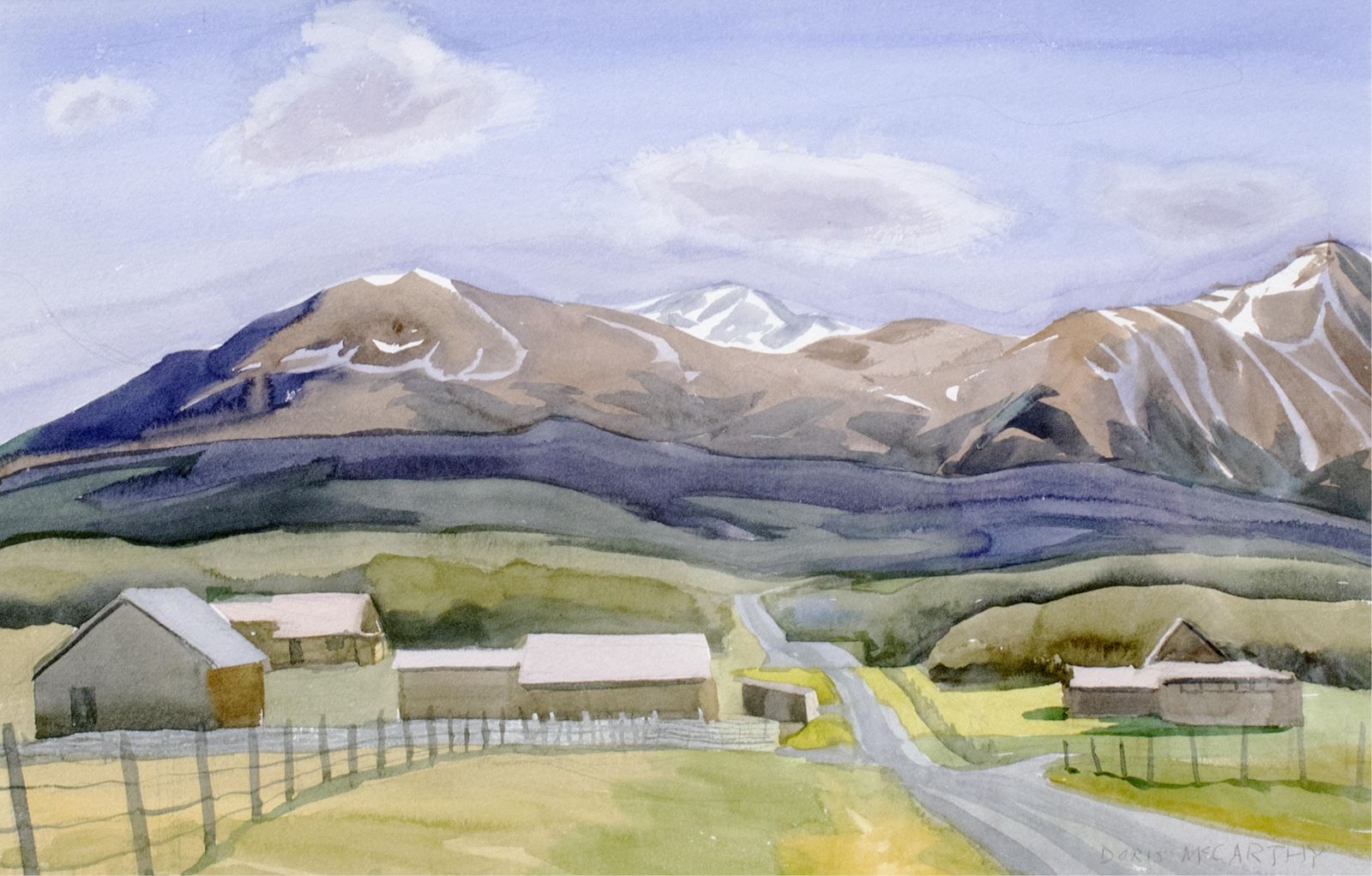 Doris McCarthy was a guest at the Cloudy Ridge Ranch in 2003, painting daily en plein air, sometimes going so far as to move farmyard objects to prepare the scene she wanted. The ranch is located near Waterton Lakes National Park.