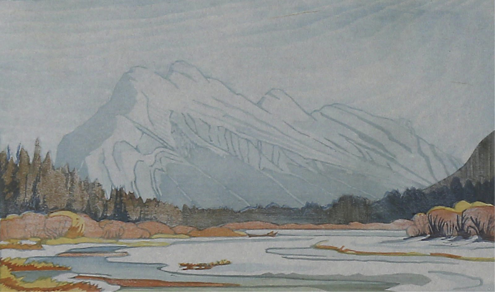signed, titled, dated & editioned Note: Alternately titled “Mount Rundle in Winter”. Illustrated p. 29 “Margaret Shelton Block Prints 1936-1984” (Ainslie, Glenbow Museum). Provenance: Douglas Udell Gallery, Edmonton (label verso)