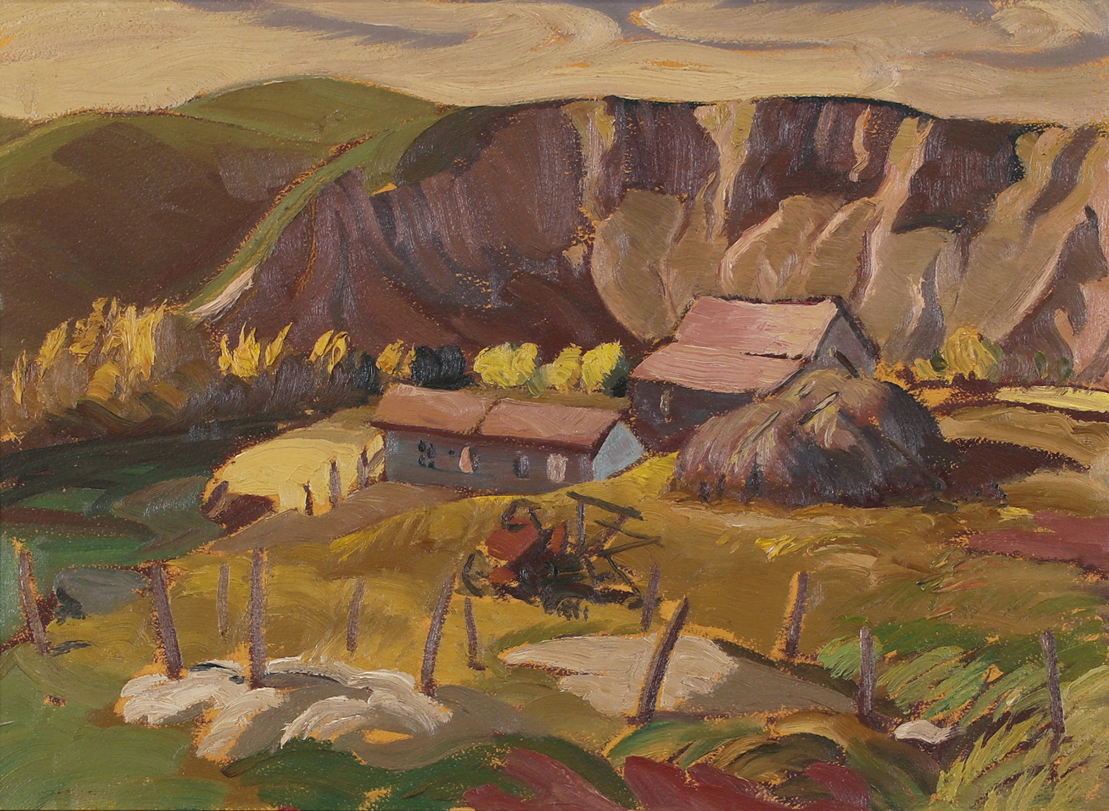 Note: Rosebud was a favoured early painting location of H. G. Glyde. In 1944, his frequent painting partner, A. Y. Jackson, suggested the pair paint there instead of completing a second trip up the Alaska Highway – Jackson had wanted to visit the area since passing through by train 16 years prior and observing from the rear platform, “…rolling country all cut up with coulees [and the little village named Rosebud]”.